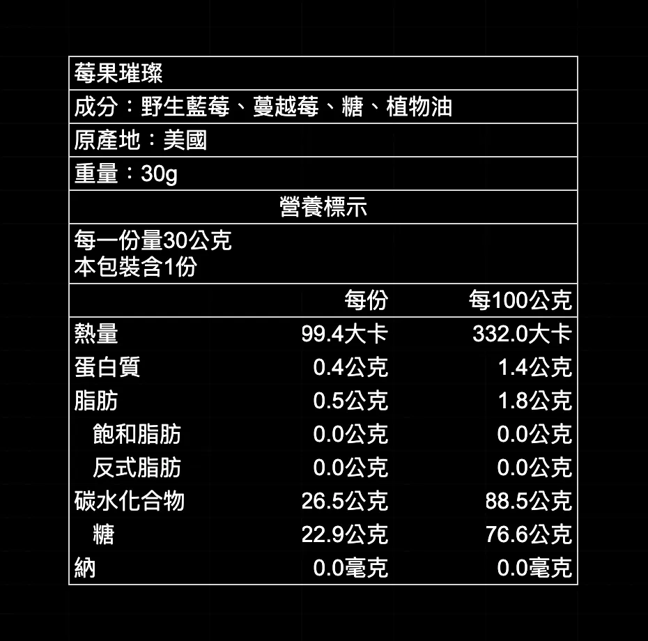 『莓果璀璨』由野生藍莓、蔓越莓組成;藍莓含有15種以上的花青素,有許多天然的抗氧化物,花青素可助於眼部的血液循環。